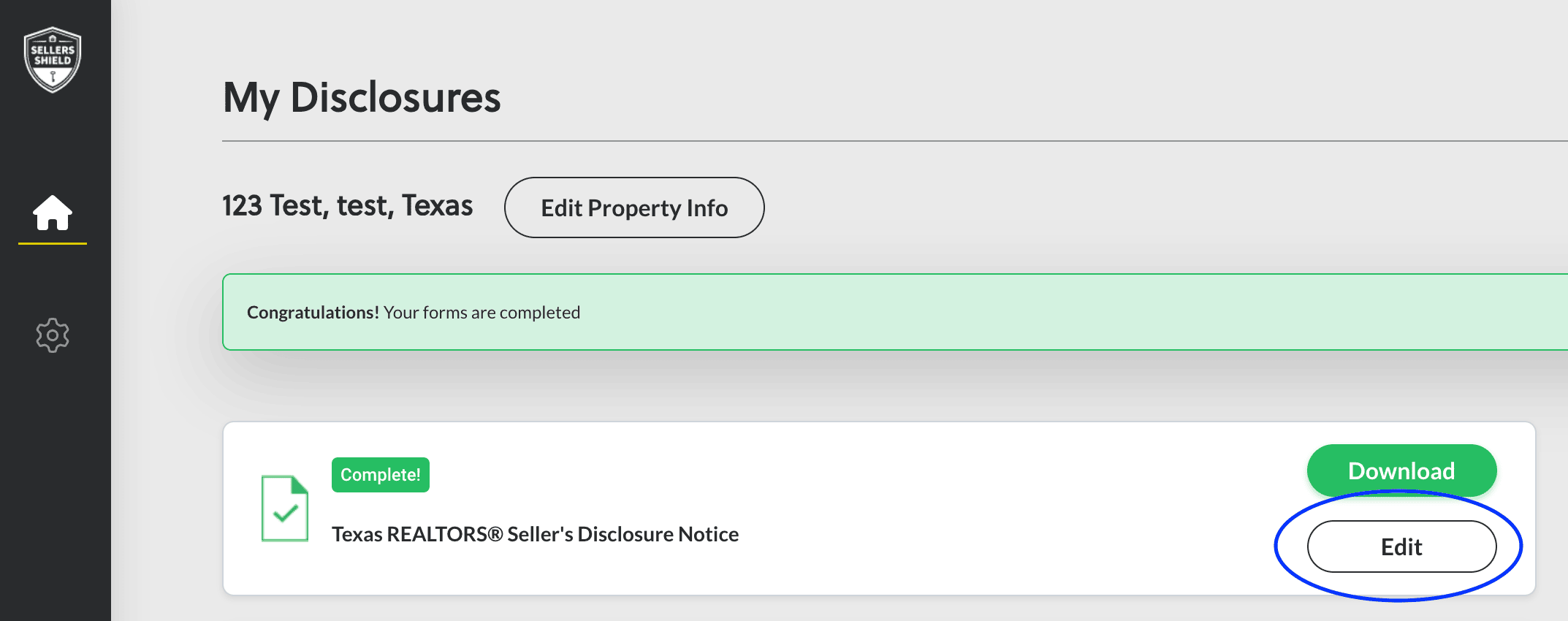 Sellers can edit their disclosure form at any time by signing back into their account at protect3.sellersshield.com and selecting the "edit" button.